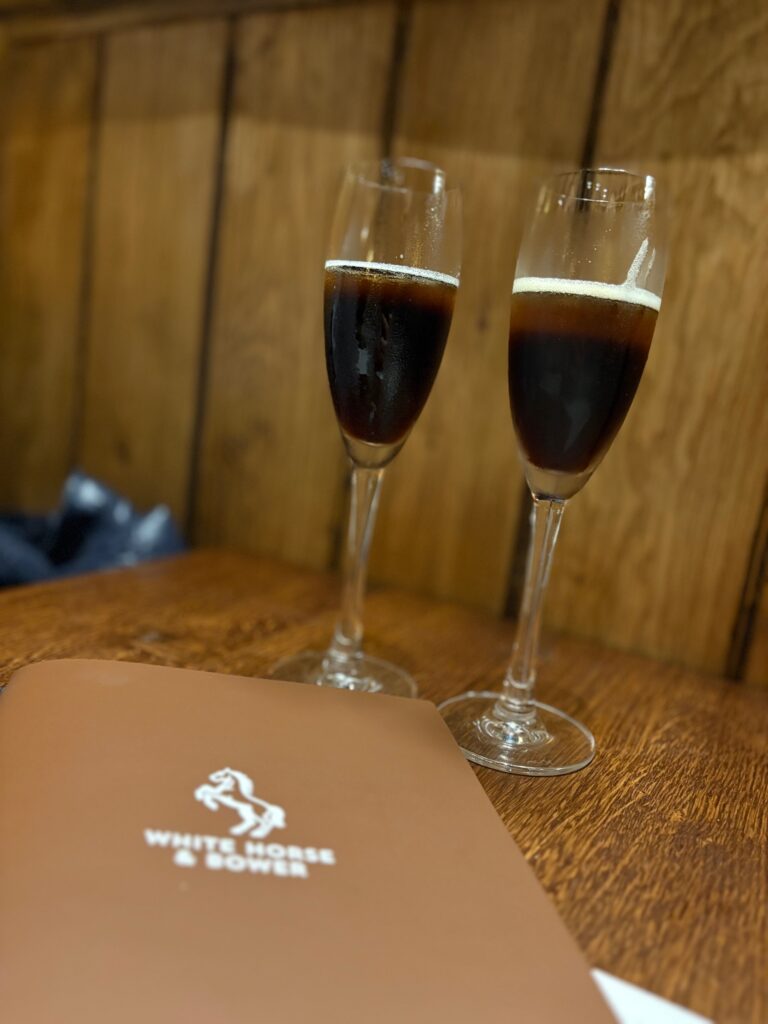 The textured wall paper in the back dining room is even more of a feature when you find out it took a number of days to hand-paint the intricate detailing of the orange coloured pattern. Seated in a booth in the dining area (admiring the wall paper) it seemed proper to order the pub’s take on a black velvet – comprising a flute of English sparkling wine with a splash of brewery’s Iron Wharf stout.