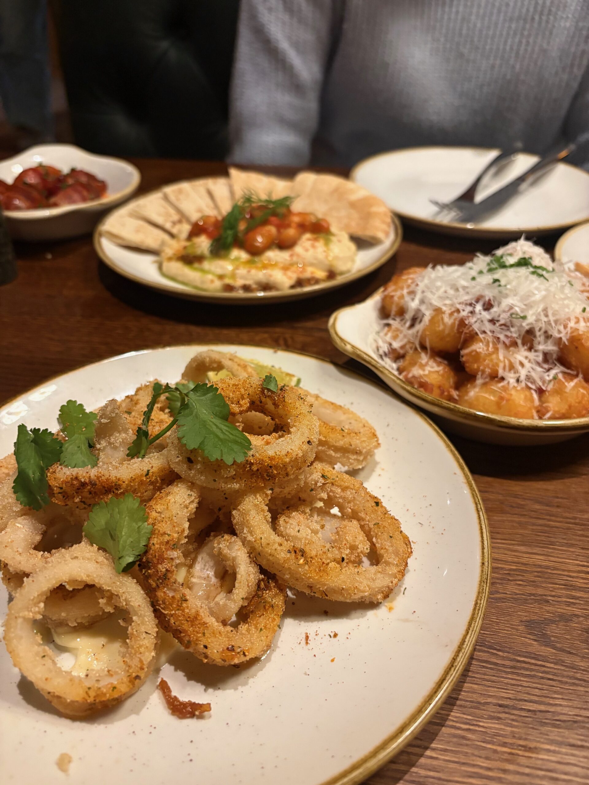 The roasted houmous was very much enhanced by the harissa butter beans and roasted seeds. Likewise the tomato bruschetta was boosted in the flavour department by the addition of pesto, shallots and balsamic glaze. Not sure what the Italians would make of it but it was pretty tasty. The plate of squid had the requisite texture but the crispy salt & pepper dusting needed a tad more seasoning to my taste.